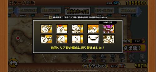 (クリア編成) 「1行目」 ムササビネコ忍者 未使用 ネコにぎり 未使用 ネコパティシエ 未使用 ネコ極上 未使用 魔界探偵グラヴィー 未使用 「2行目」 大狂乱のゴムネコ Lv50 ネコパーフェクト Lv50+40(本能:生き残る Lv10、毒撃ダメージ無効、基本攻撃…