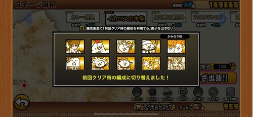 (クリア編成) 「1行目」 ねこラーメン道 Lv50+33(本能:基本体力アップ Lv10、基本攻撃力アップ Lv10) ちびネコ島 Lv30+55 戦隊パワーショベリン Lv30 スターもねこLv30 狂乱のスターもねこ Lv30 「2行目」 大狂乱のゴムネコ Lv50 飛脚ネコ Lv50 ねこ…