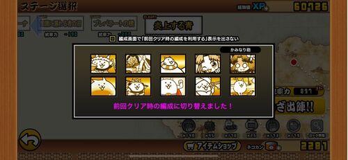 (クリア編成) 「1行目」 大狂乱のネコモヒカン Lv20 大狂乱のゴムネコ Lv50 大狂乱の暗黒ネコ Lv30 大狂乱のムキあしネコ Lv50 大狂乱のネコライオン Lv50 「2行目」 ジャイにゃん Lv50 ネコエクスプレス Lv50 覚醒のネコムート Lv40 飛翔の武神・真田幸…