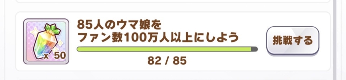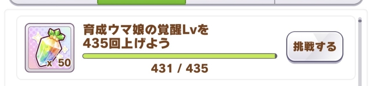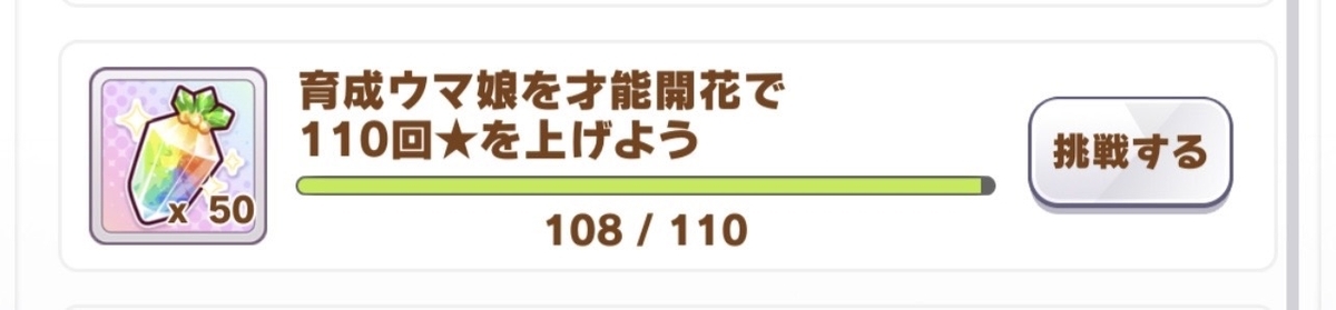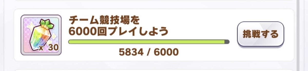 競技場を一定数プレイすると、ほんの少しではあるがジュエルが貰える。ただし、これを達成するためだけににんじんゼリー(競技場をプレイする際に消費するRPを回復させるアイテム)を使うのは勿体無いので、前述したようにあるウマ娘の親愛度を競技場プレイによって上げたい場合に使った方が良いと考える。