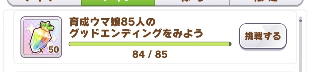 意外と見落としがちな報酬の一つだろう。育成ウマ娘のストーリーが読めないプロジェクトL'Arcやクライマックスといったシナリオでウマ娘を育成をした場合、グッドエンディングを見れずに育成が完了してしまう。そのため、それらのシナリオでしか育成をしていないウマ娘がいるのなら、そのウマ娘を他のシナリオで最後まで育成することでジュエルを50個貰える。