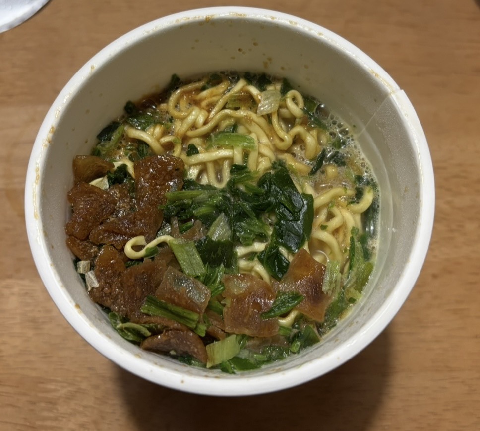 こんな感じになった。撮り方が下手なので見栄えが悪くなってしまったかもしれない。具材はほうれん草とねぎと小さい肉。これに付属の特製オイルを入れるのだが、その前に一口スープを味見してみた。オイルの重要性を改めて知った。